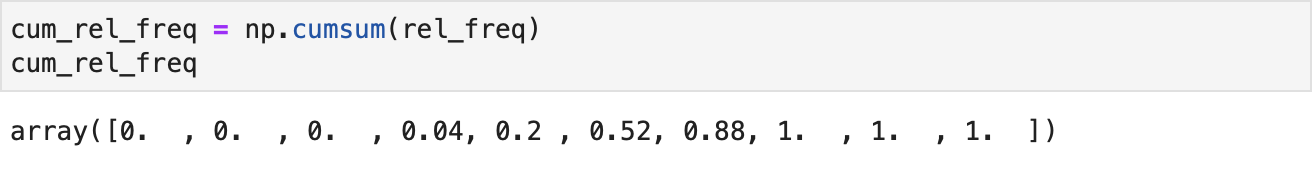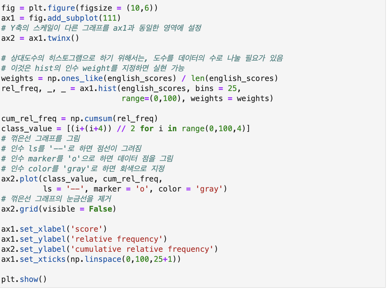 - 상대도수의 히스토그램을 누적상대도수의 꺾은선 그래프와 함께 그림.