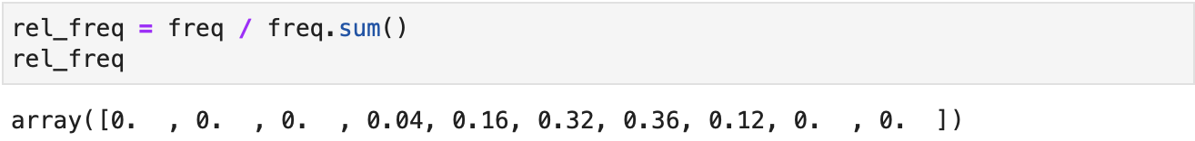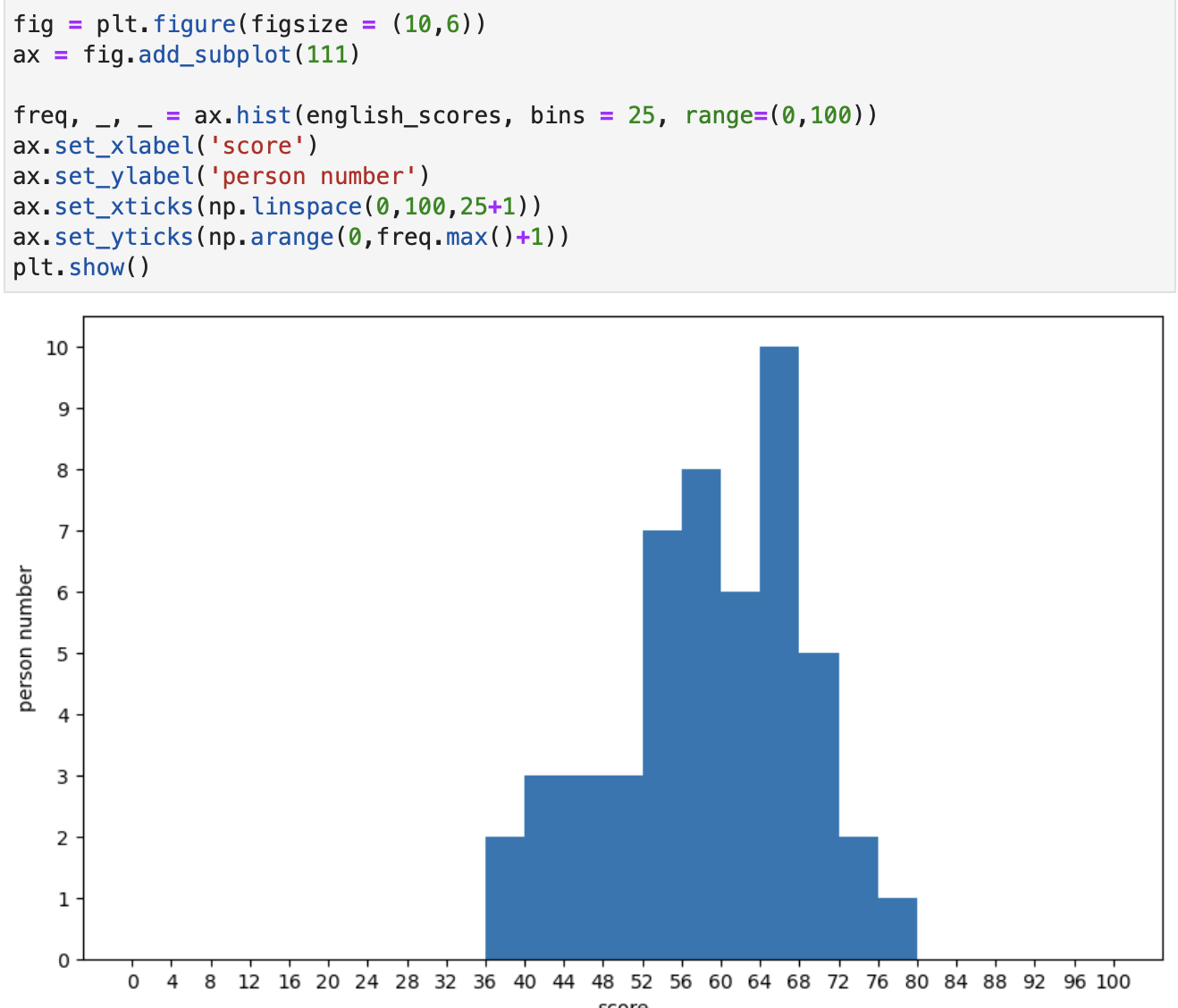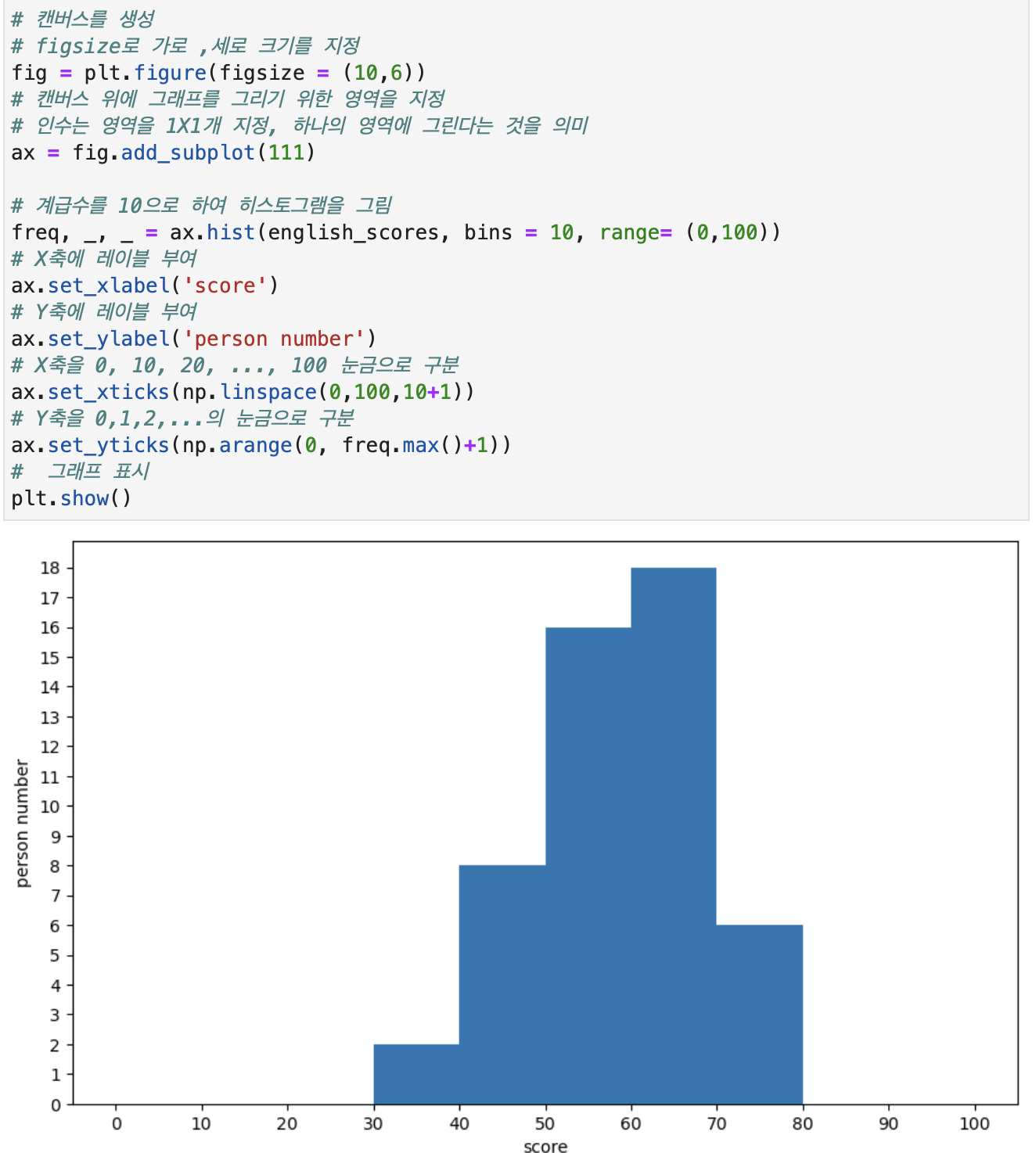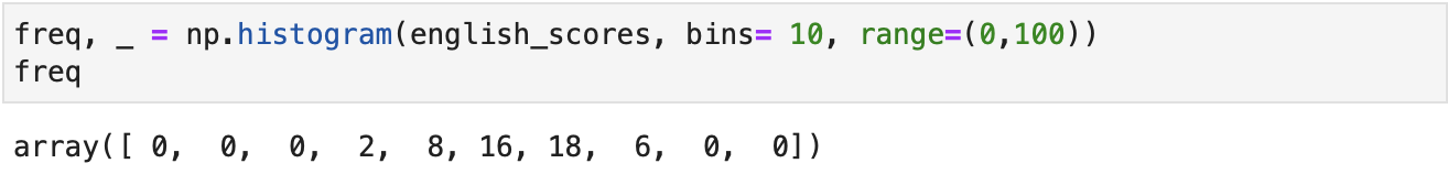 - np.histogram으로 도수 구현, bins로 계급수를, range로 최솟값과 최댓값을 지정.