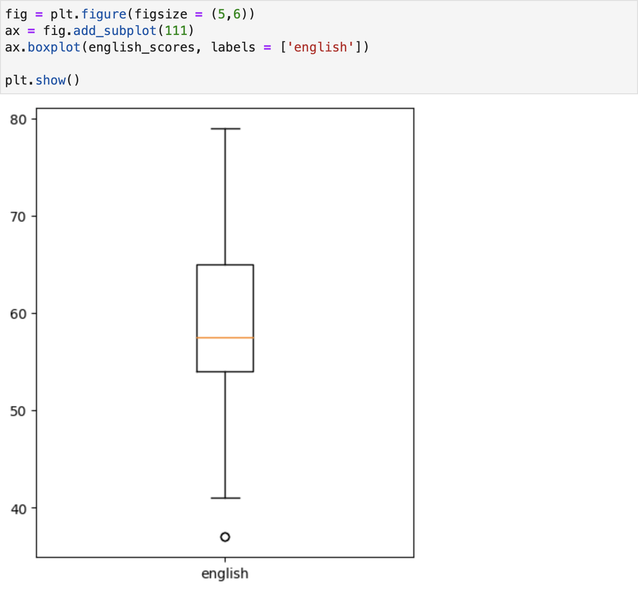 분석: 상자그림에서도 60점 전후의 점수를 받은 학생이 많다는 것을 알 수 있다.