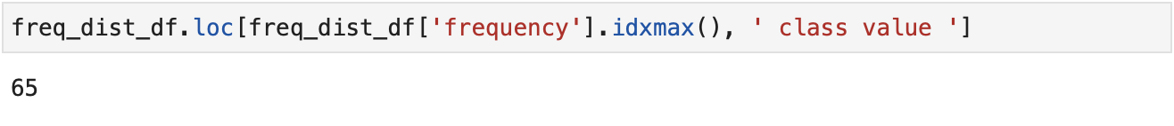** 주의) 최빈값은 도수분포표를 만드는 방법에 의존한다. (특히, 계급폭. 계급폭이 4로 하려 도수분포료를 계산하면 최빈값은 66이 된다.)