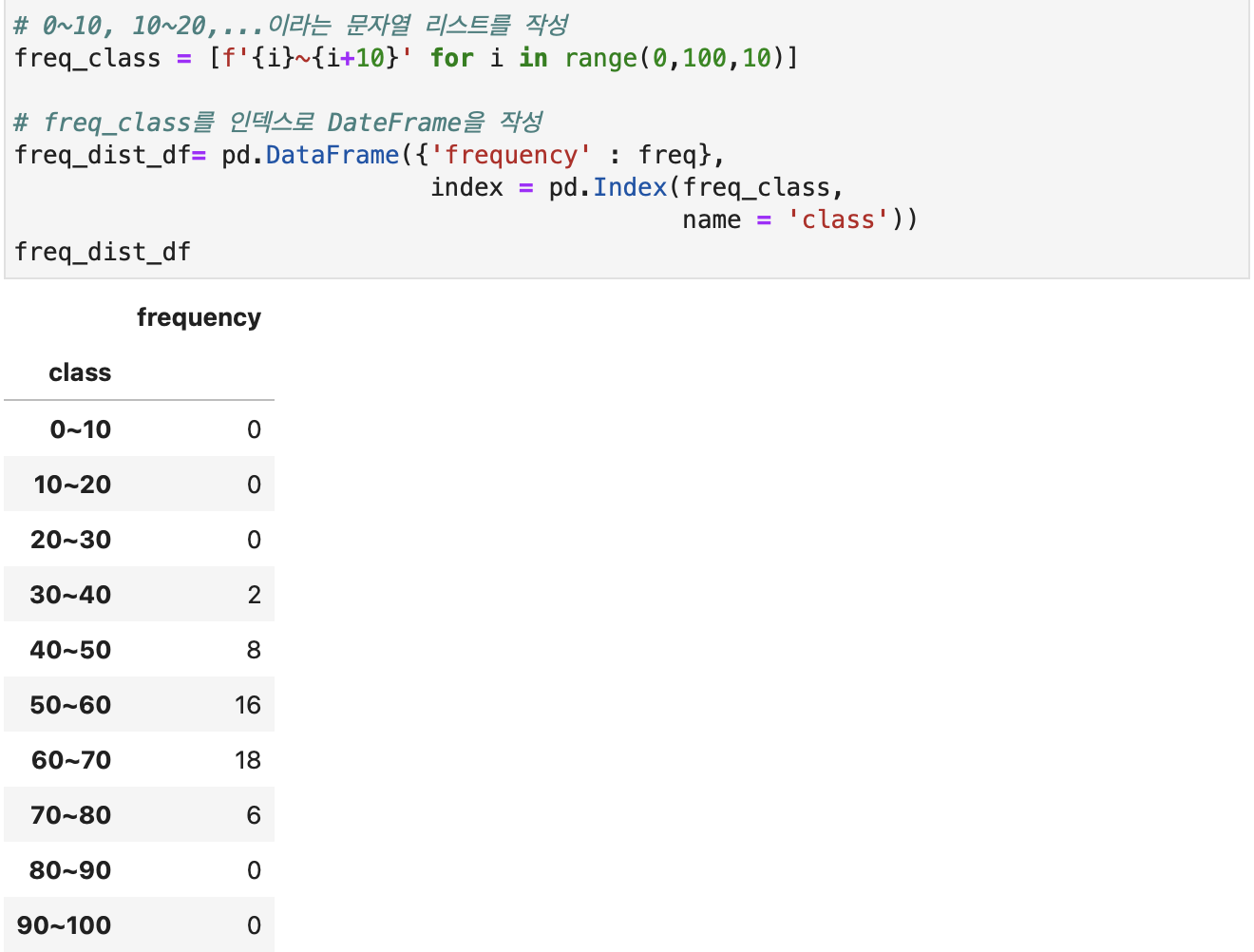 descrbie로 평균이나 분산, 시분위수 등의 지표로 데이터 중심이나 산포도 상태를 알 수 있지만 조금 더 세부적인 데이터 분포 상태를 알고 싶을 경우, 데이터가 취하는 값을 몇 개의 구간으로 나누고 각 구간에 몇 개의 데이터가 들어가는지를 세는 방법이 있다.