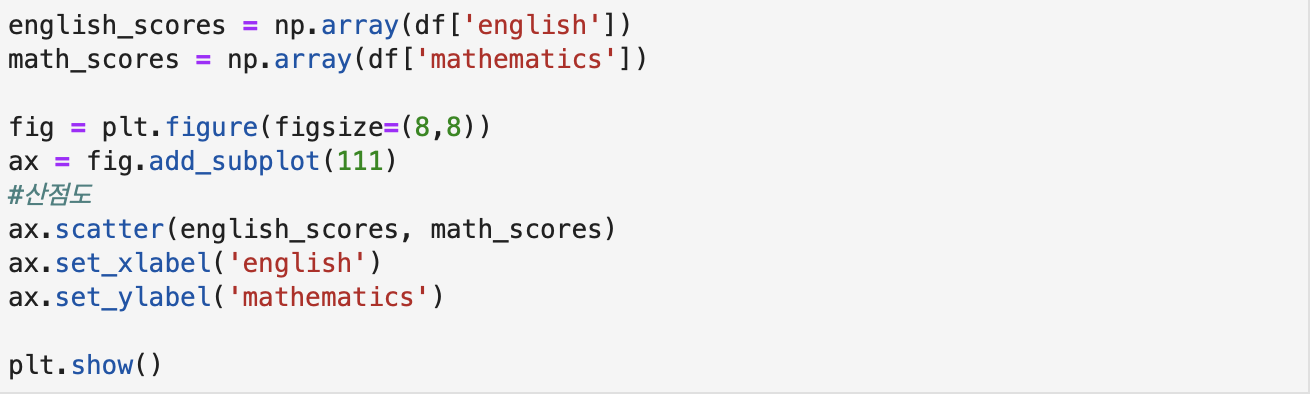 - Matplotlib에서 scatter메서드를 사용해 그린 산점도, scatter의 첫 번째 인수가 x축, 두 번째 인수가 y축의 데이터.