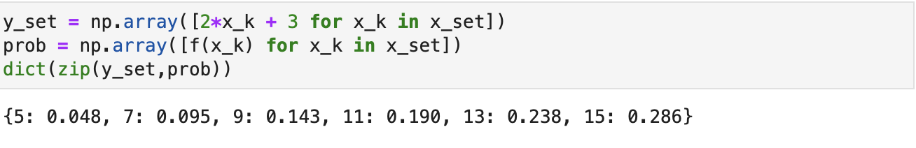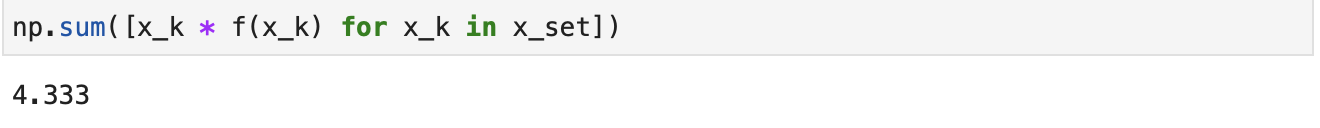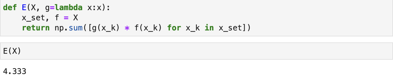 - 인수 g가 확률변수에 대한 변환의 함수, g에 아무것도 지정하지 않으면 확률변수 X의 기댓값이 구해진다