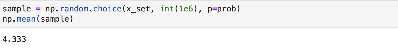 현실적으로 무제한으로 시행을 할 수 없기에 이산형 확률변수의 경우, 확률변수의 평균은 확률변수가 취할 수 있는 값과 그 확률의 곱의 총합으로 정의된다.